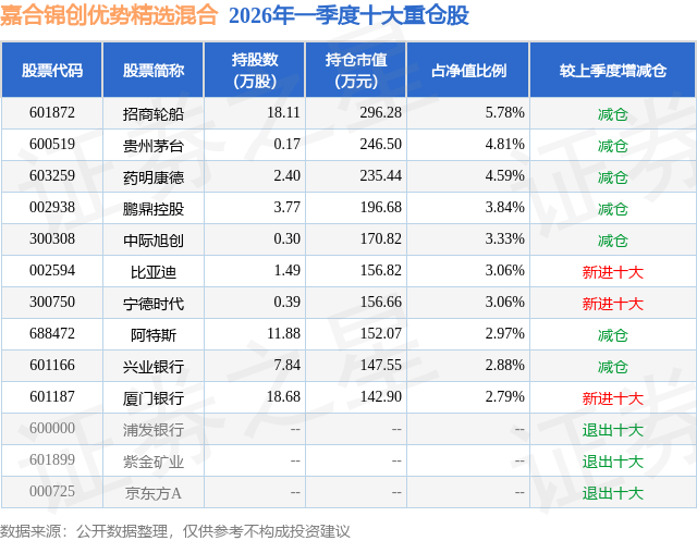 从基金规模来看,嘉合锦创优势精选混合基金2026年一季度公布的基金规模为0.51亿元,较上一期规模5070.4万元变化了54.23万元,环比变化了1.07%。该基金最新一期资产配置为:股票占净值比87.48%,无债券类资产,现金占净值比12.77%。从基金持仓来看,该基金当季前十大股票仓位达37.11%,第一大重仓股为招商轮船(601872),持仓占比为5.78%。