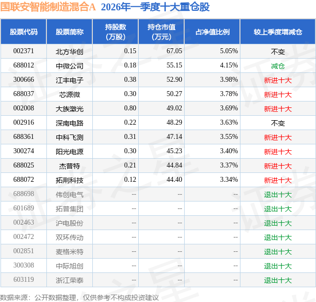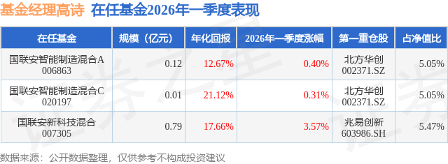 证券之星消息,日前国联安智能制造混合A基金公布一季报,2026年一季度最新规模0.12亿元,季度净值涨幅为0.4%。