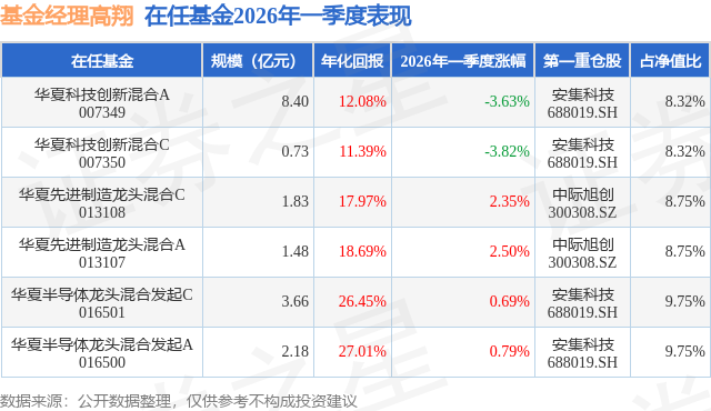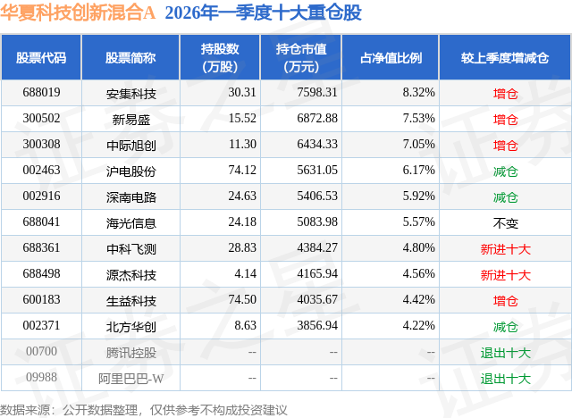 从基金规模来看,华夏科技创新混合A基金2026年一季度公布的基金规模为8.4亿元,较上一期规模6.64亿元变化了1.76亿元,环比变化了26.58%。该基金最新一期资产配置为:股票占净值比91.33%,无债券类资产,现金占净值比7.7%。从基金持仓来看,该基金当季前十大股票仓位达58.56%,第一大重仓股为安集科技(688019),持仓占比为8.32%。