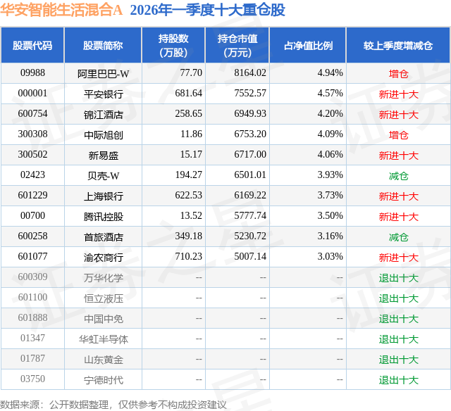 从基金规模来看,华安智能生活混合A基金2026年一季度公布的基金规模为14.35亿元,较上一期规模18.16亿元变化了-3.81亿元,环比变化了-21.0%。该基金最新一期资产配置为:股票占净值比87.32%,无债券类资产,现金占净值比13.07%。从基金持仓来看,该基金当季前十大股票仓位达39.21%,第一大重仓股为阿里巴巴-W(09988),持仓占比为4.94%。