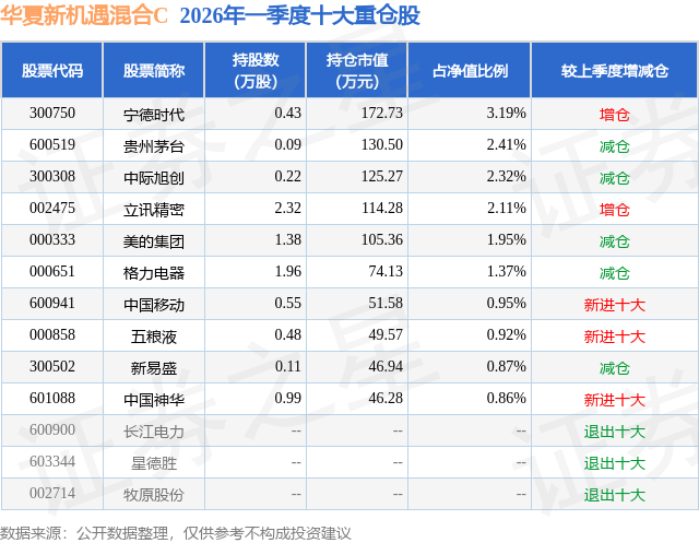 从基金规模来看,华夏新机遇混合C基金2026年一季度公布的基金规模为0.12亿元,较上一期规模1584.6万元变化了-354.99万元,环比变化了-22.4%。该基金最新一期资产配置为:股票占净值比61.73%,债券占净值比4.5%,现金占净值比33.97%。从基金持仓来看,该基金当季前十大股票仓位达16.95%,第一大重仓股为宁德时代(300750),持仓占比为3.19%。