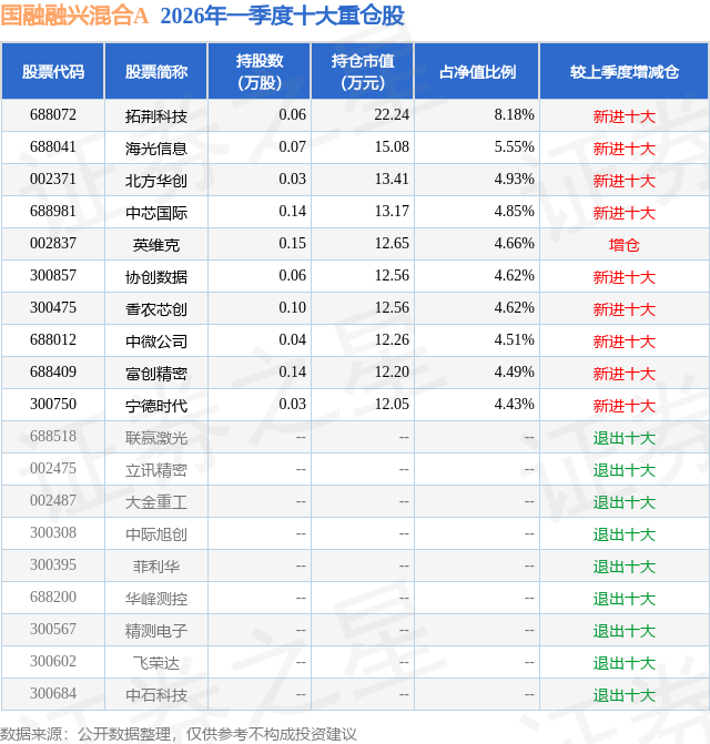 证券之星消息,日前国融融兴混合A基金公布一季报,2026年一季度最新规模0.01亿元,季度净值涨幅为-17.9%。