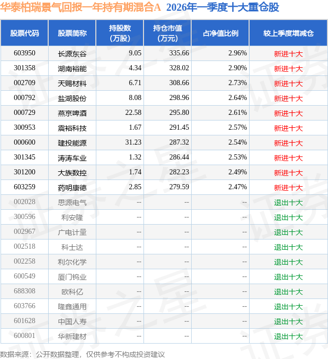 证券之星消息,日前华泰柏瑞景气回报一年持有期混合A基金公布一季报,2026年一季度最新规模1.1亿元,季度净值涨幅为4.02%。