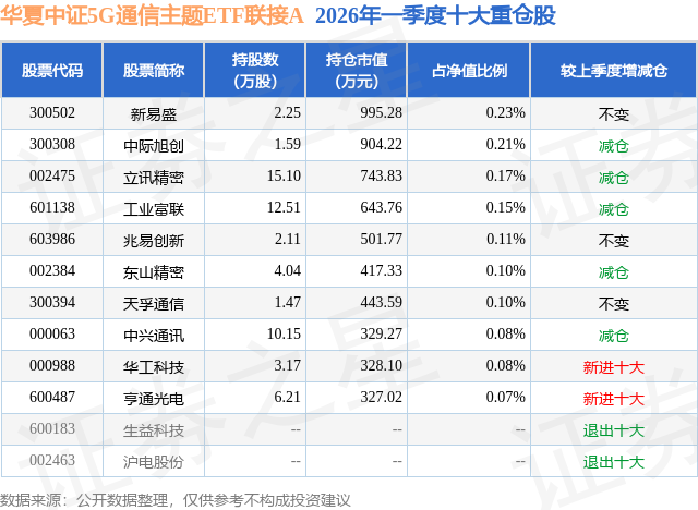 从基金规模来看,华夏中证5G通信主题ETF联接A基金2026年一季度公布的基金规模为18.97亿元,较上一期规模21.0亿元变化了-2.03亿元,环比变化了-9.67%。该基金最新一期资产配置为:股票占净值比2.2%,无债券类资产,现金占净值比5.37%。从基金持仓来看,该基金当季前十大股票仓位达1.3%,第一大重仓股为新易盛(300502),持仓占比为0.23%。