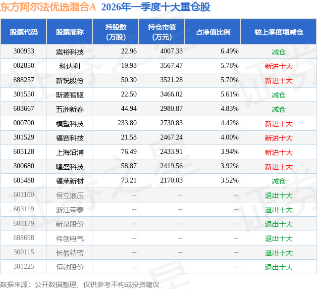 从基金规模来看,东方阿尔法优选混合A基金2026年一季度公布的基金规模为0.53亿元,较上一期规模6194.64万元变化了-942.48万元,环比变化了-15.21%。该基金最新一期资产配置为:股票占净值比93.89%,债券占净值比10.92%,现金占净值比1.86%。从基金持仓来看,该基金当季前十大股票仓位达48.21%,第一大重仓股为震裕科技(300953),持仓占比为6.49%。