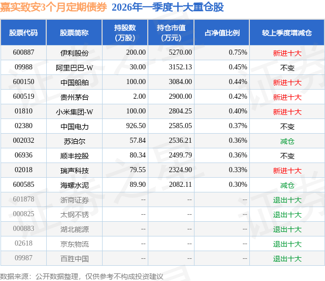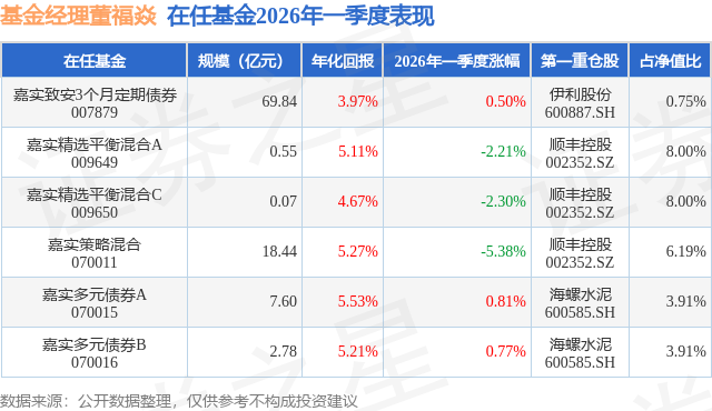 从基金规模来看,嘉实致安3个月定期债券基金2026年一季度公布的基金规模为69.84亿元,较上一期规模54.32亿元变化了15.52亿元,环比变化了28.58%。该基金最新一期资产配置为:股票占净值比13.75%,债券占净值比122.18%,现金占净值比5.73%。从基金持仓来看,该基金当季前十大股票仓位达4.18%,第一大重仓股为伊利股份(600887),持仓占比为0.75%。