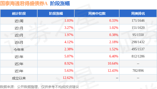 从业绩表现来看,国泰海通君得盛债券A基金过去一年净值涨幅为5.07%,在同类基金中排名812/1286,同类基金过去一年净值涨幅中位数为6.4%。而基金过去一年的最大回撤为-3.94%,成立以来的最大回撤为-12.82%。