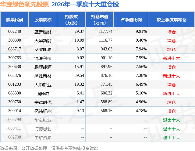 从基金规模来看,华宝绿色领先股票基金2026年一季度公布的基金规模为1.19亿元,较上一期规模6189.72万元变化了5690.0万元,环比变化了91.93%。该基金最新一期资产配置为:股票占净值比92.02%,无债券类资产,现金占净值比8.04%。从基金持仓来看,该基金当季前十大股票仓位达71.11%,第一大重仓股为盛新锂能(002240),持仓占比为9.91%。