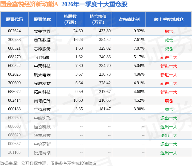从基金规模来看,国金鑫悦经济新动能A基金2026年一季度公布的基金规模为0.28亿元,较上一期规模3819.87万元变化了-982.26万元,环比变化了-25.71%。该基金最新一期资产配置为:股票占净值比94.13%,无债券类资产,现金占净值比7.36%。从基金持仓来看,该基金当季前十大股票仓位达57.18%,第一大重仓股为完美世界(002624),持仓占比为9.32%。