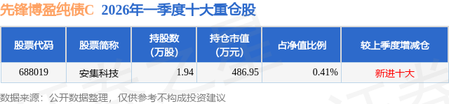 从基金规模来看,先锋博盈纯债C基金2026年一季度公布的基金规模为0.0亿元,较上一期规模6.61万元变化了-0.76万元,环比变化了-11.56%。该基金最新一期资产配置为:股票占净值比0.41%,债券占净值比113.25%,现金占净值比0.34%。从基金持仓来看,该基金当季前十大股票仓位达0.41%,第一大重仓股为安集科技(688019),持仓占比为0.41%。