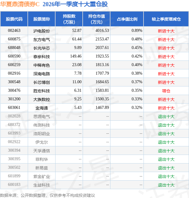 从基金规模来看,华夏鼎清债券C基金2026年一季度公布的基金规模为3.32亿元,较上一期规模1534.65万元变化了3.16亿元,环比变化了2060.61%。该基金最新一期资产配置为:股票占净值比16.59%,债券占净值比84.84%,现金占净值比1.31%。从基金持仓来看,该基金当季前十大股票仓位达4.39%,第一大重仓股为沪电股份(002463),持仓占比为0.89%。