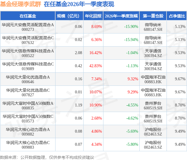 证券之星消息,日前华润元大富时中国A50指数C基金公布一季报,2026年一季度最新规模0.06亿元,季度净值涨幅为-4.62%。