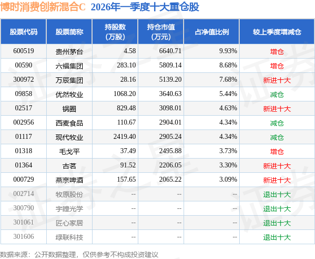 从基金规模来看,博时消费创新混合C基金2026年一季度公布的基金规模为1.02亿元,较上一期规模1.32亿元变化了-2976.0万元,环比变化了-22.5%。该基金最新一期资产配置为:股票占净值比80.93%,无债券类资产,现金占净值比21.44%。从基金持仓来看,该基金当季前十大股票仓位达55.16%,第一大重仓股为贵州茅台(600519),持仓占比为9.93%。