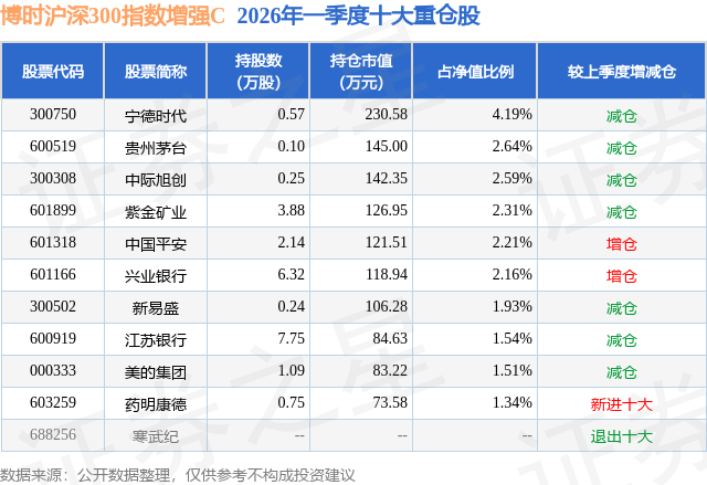 证券之星消息,日前博时沪深300指数增强C基金公布一季报,2026年一季度最新规模0.15亿元,季度净值涨幅为-2.45%。