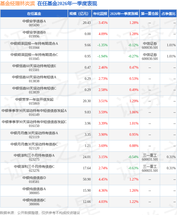 从基金规模来看,中银顺泽回报一年持有期混合A基金2026年一季度公布的基金规模为9.66亿元,较上一期规模15.89亿元变化了-6.23亿元,环比变化了-39.21%。该基金最新一期资产配置为:股票占净值比12.73%,债券占净值比115.24%,现金占净值比2.45%。从基金持仓来看,该基金当季前十大股票仓位达4.92%,第一大重仓股为中信证券(600030),持仓占比为1.01%。