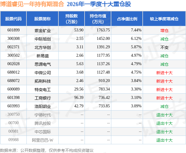 从基金规模来看,博道睿见一年持有期混合基金2026年一季度公布的基金规模为2.37亿元,较上一期规模2.78亿元变化了-4089.36万元,环比变化了-14.71%。该基金最新一期资产配置为:股票占净值比79.56%,债券占净值比6.28%,现金占净值比14.34%。从基金持仓来看,该基金当季前十大股票仓位达47.27%,第一大重仓股为紫金矿业(601899),持仓占比为7.44%。
