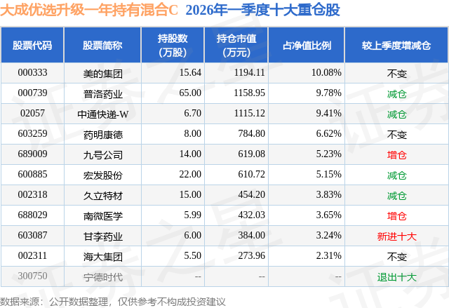 证券之星消息,日前大成优选升级一年持有混合C基金公布一季报,2026年一季度最新规模0.05亿元,季度净值涨幅为-1.59%。