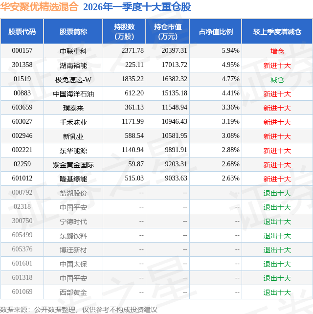 从基金规模来看,华安聚优精选混合基金2026年一季度公布的基金规模为34.34亿元,较上一期规模39.21亿元变化了-4.86亿元,环比变化了-12.41%。该基金最新一期资产配置为:股票占净值比86.2%,债券占净值比0.33%,现金占净值比16.16%。从基金持仓来看,该基金当季前十大股票仓位达37.89%,第一大重仓股为中联重科(000157),持仓占比为5.94%。