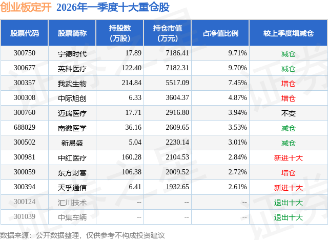 从基金规模来看,创业板定开基金2026年一季度公布的基金规模为5.57亿元,较上一期规模4.6亿元变化了9727.93万元,环比变化了21.14%。该基金最新一期资产配置为:股票占净值比88.93%,无债券类资产,现金占净值比11.42%。从基金持仓来看,该基金当季前十大股票仓位达50.38%,第一大重仓股为宁德时代(300750),持仓占比为9.71%。