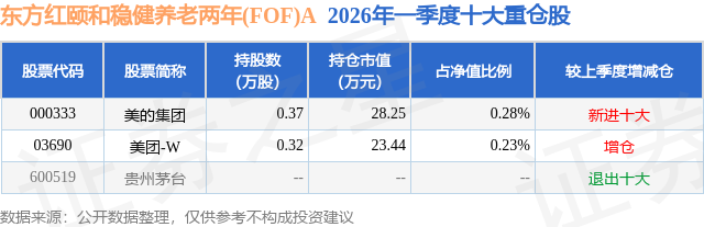 从基金规模来看,东方红颐和稳健养老两年(FOF)A基金2026年一季度公布的基金规模为0.6亿元,较上一期规模4618.66万元变化了1420.44万元,环比变化了30.75%。该基金最新一期资产配置为:股票占净值比0.51%,债券占净值比5.68%,现金占净值比6.89%。从基金持仓来看,该基金当季前十大股票仓位达0.51%,第一大重仓股为美的集团(000333),持仓占比为0.28%。