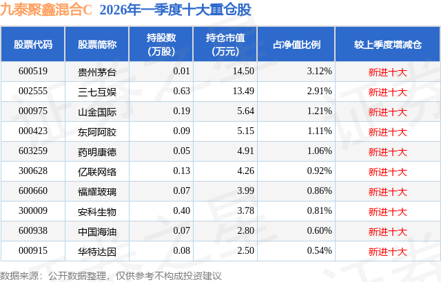 证券之星消息,日前九泰聚鑫混合C基金公布一季报,2026年一季度最新规模0.03亿元,季度净值涨幅为0.49%。