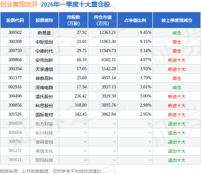 从基金规模来看,创业富国定开基金2026年一季度公布的基金规模为13.08亿元,较上一期规模7.98亿元变化了5.1亿元,环比变化了63.88%。该基金最新一期资产配置为:股票占净值比72.61%,无债券类资产,现金占净值比25.16%。从基金持仓来看,该基金当季前十大股票仓位达52.37%,第一大重仓股为新易盛(300502),持仓占比为9.45%。