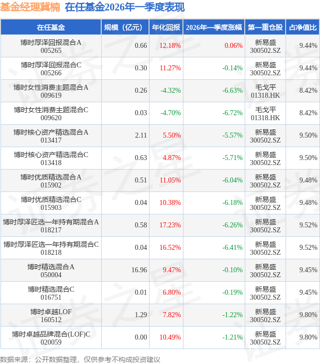证券之星消息,日前博时女性消费主题混合C基金公布一季报,2026年一季度最新规模0.03亿元,季度净值涨幅为-6.72%。