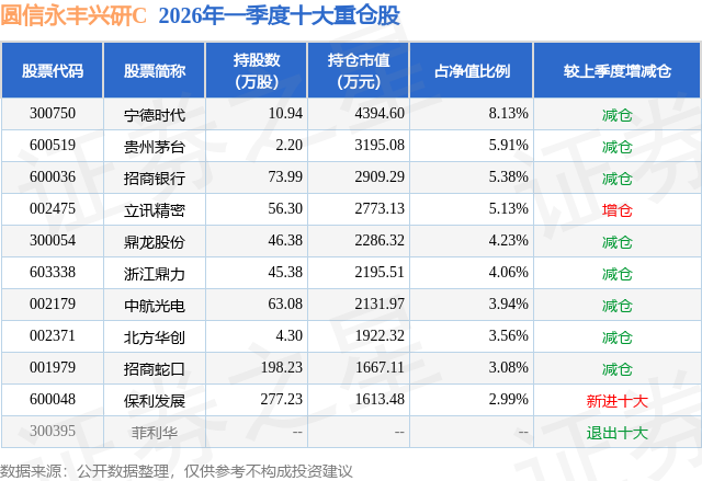 从基金规模来看,圆信永丰兴研C基金2026年一季度公布的基金规模为0.27亿元,较上一期规模5556.14万元变化了-2844.46万元,环比变化了-51.19%。该基金最新一期资产配置为:股票占净值比93.56%,债券占净值比6.04%,现金占净值比0.71%。从基金持仓来看,该基金当季前十大股票仓位达46.41%,第一大重仓股为宁德时代(300750),持仓占比为8.13%。