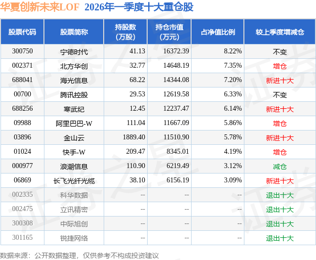 从基金规模来看,华夏创新未来LOF基金2026年一季度公布的基金规模为19.93亿元,较上一期规模21.87亿元变化了-1.94亿元,环比变化了-8.88%。该基金最新一期资产配置为:股票占净值比88.92%,债券占净值比7.13%,现金占净值比4.79%。从基金持仓来看,该基金当季前十大股票仓位达57.28%,第一大重仓股为宁德时代(300750),持仓占比为8.22%。