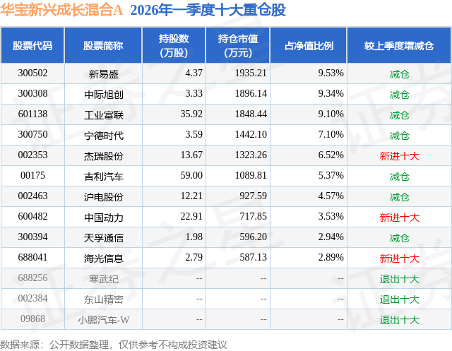 从基金规模来看,华宝新兴成长混合A基金2026年一季度公布的基金规模为1.98亿元,较上一期规模2.6亿元变化了-6168.08万元,环比变化了-23.75%。该基金最新一期资产配置为:股票占净值比81.49%,无债券类资产,现金占净值比18.85%。从基金持仓来看,该基金当季前十大股票仓位达60.89%,第一大重仓股为新易盛(300502),持仓占比为9.53%。