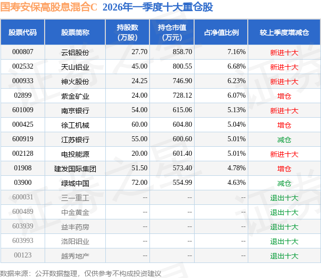 从基金规模来看,国寿安保高股息混合C基金2026年一季度公布的基金规模为0.42亿元,较上一期规模3211.01万元变化了951.14万元,环比变化了29.62%。该基金最新一期资产配置为:股票占净值比93.95%,无债券类资产,现金占净值比6.21%。从基金持仓来看,该基金当季前十大股票仓位达55.74%,第一大重仓股为云铝股份(000807),持仓占比为7.16%。