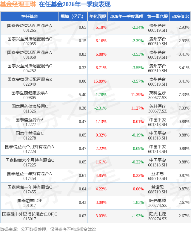 国泰医药健康股票A现任基金经理为王琳,本季度增聘基金经理王琳,近期离任的基金经理为徐治彪。其中在任基金经理王琳已从业9年又90天,2026年1月22日正式接手管理国泰医药健康股票A,任职期间累计回报为-2.57%。目前还管理着15只基金产品(包括A类和C类),其中本季度表现最佳的基金为国泰医药健康股票A(009805),季度净值涨幅为11.39%。