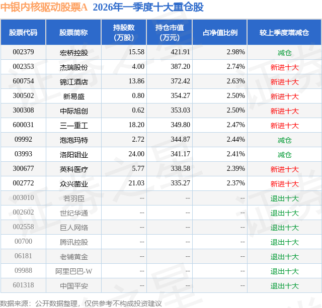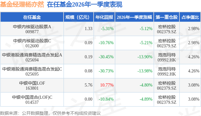 从基金规模来看,中银内核驱动股票A基金2026年一季度公布的基金规模为1.33亿元,较上一期规模1.48亿元变化了-1553.19万元,环比变化了-10.48%。该基金最新一期资产配置为:股票占净值比90.06%,债券占净值比6.66%,现金占净值比5.21%。从基金持仓来看,该基金当季前十大股票仓位达25.43%,第一大重仓股为宏桥控股(002379),持仓占比为2.98%。