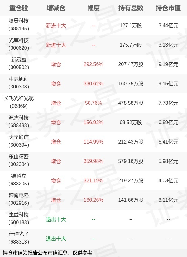 证券之星消息,4月22日华泰柏瑞基金旗下陈文凯管理的华泰柏瑞质量成长混合型基金公布一季报,近1年净值增长率340.76%。与上一季度相比,该基金前十大重仓股新增腾景科技,光库科技;并对新易盛增仓154.62万股,为该基金第一大重仓股;生益科技,仕佳光子等退出前十大重仓股;详细数据如下: