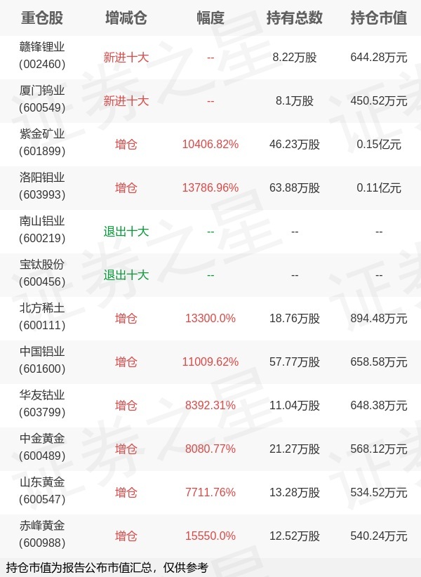 证券之星消息,4月22日南方基金旗下崔蕾管理的南方中证申万有色金属交易型开放式指数基金发起式联接基金公布一季报,近1年净值增长率97.92%。与上一季度相比,该基金前十大重仓股新增赣锋锂业,厦门钨业;并对紫金矿业增仓45.79万股,为该基金第一大重仓股;南山铝业,宝钛股份等退出前十大重仓股;详细数据如下: