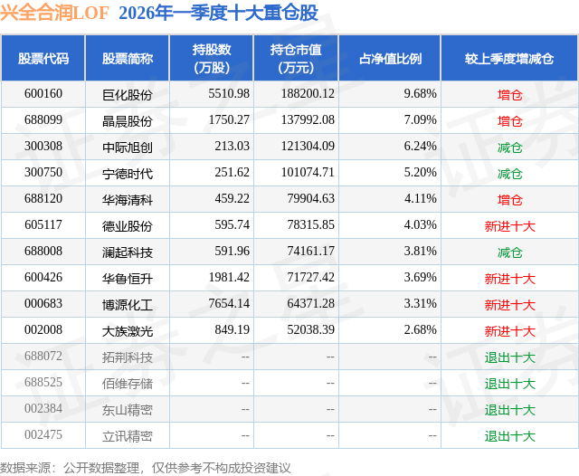 从基金规模来看,兴全合润LOF基金2026年一季度公布的基金规模为192.88亿元,较上一期规模228.7亿元变化了-35.82亿元,环比变化了-15.66%。该基金最新一期资产配置为:股票占净值比83.73%,债券占净值比5.84%,现金占净值比10.24%。从基金持仓来看,该基金当季前十大股票仓位达49.84%,第一大重仓股为巨化股份(600160),持仓占比为9.68%。