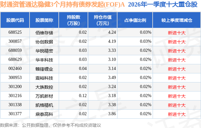 从基金规模来看,财通资管通达稳健3个月持有债券发起(FOF)A基金2026年一季度公布的基金规模为1.02亿元,较上一期规模3874.3万元变化了6310.18万元,环比变化了162.87%。该基金最新一期资产配置为:股票占净值比1.0%,债券占净值比4.9%,现金占净值比7.1%。从基金持仓来看,该基金当季前十大股票仓位达0.22%,第一大重仓股为佰维存储(688525),持仓占比为0.03%。