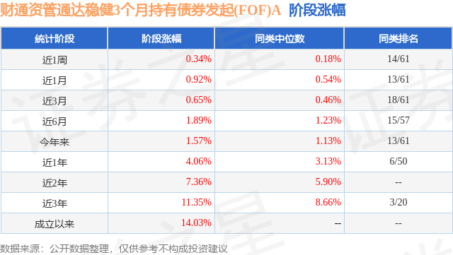 从业绩表现来看,财通资管通达稳健3个月持有债券发起(FOF)A基金过去一年净值涨幅为4.06%,在同类基金中排名6/50,同类基金过去一年净值涨幅中位数为3.13%。而基金过去一年的最大回撤为-1.35%,成立以来的最大回撤为-1.35%。