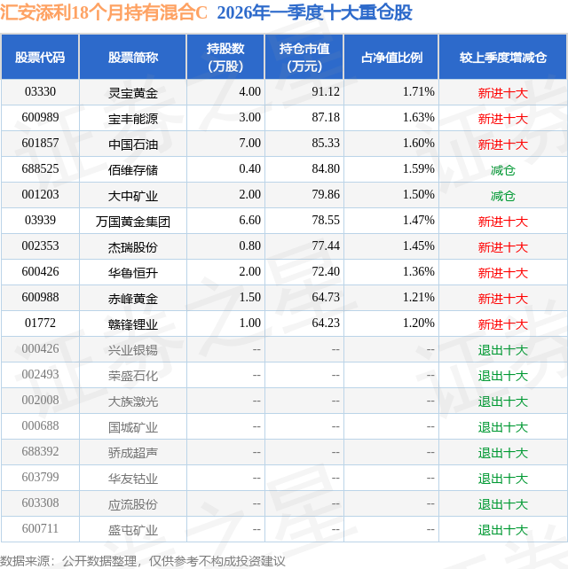 从基金规模来看,汇安添利18个月持有混合C基金2026年一季度公布的基金规模为0.22亿元,较上一期规模4781.92万元变化了-2592.67万元,环比变化了-54.22%。该基金最新一期资产配置为:股票占净值比26.61%,债券占净值比46.43%,现金占净值比4.68%。从基金持仓来看,该基金当季前十大股票仓位达14.72%,第一大重仓股为灵宝黄金(03330),持仓占比为1.71%。