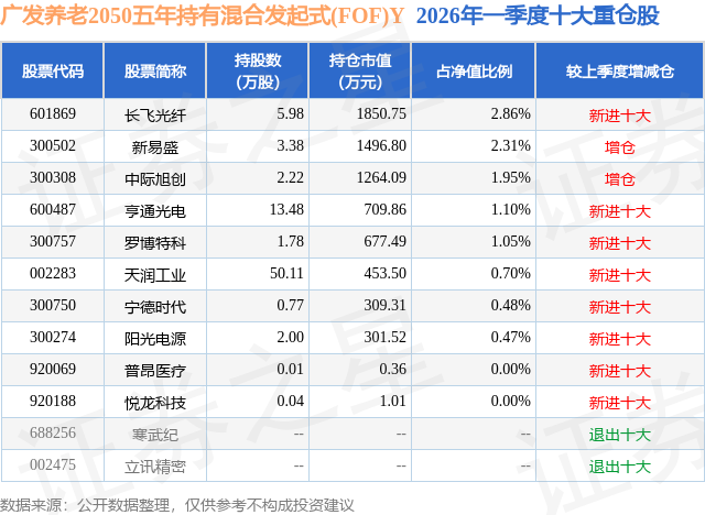 从基金规模来看,广发养老2050五年持有混合发起式(FOF)Y基金2026年一季度公布的基金规模为4.06亿元,较上一期规模1.49亿元变化了2.56亿元,环比变化了171.52%。该基金最新一期资产配置为:股票占净值比10.9%,无债券类资产,现金占净值比6.67%。从基金持仓来看,该基金当季前十大股票仓位达10.92%,第一大重仓股为长飞光纤(601869),持仓占比为2.86%。