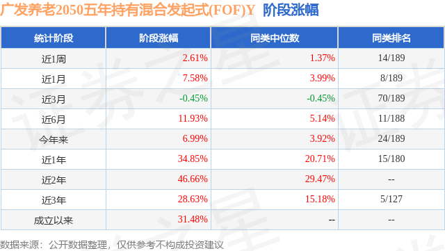 从业绩表现来看,广发养老2050五年持有混合发起式(FOF)Y基金过去一年净值涨幅为34.85%,在同类基金中排名15/180,同类基金过去一年净值涨幅中位数为20.71%。而基金过去一年的最大回撤为-13.16%,成立以来的最大回撤为-13.16%。