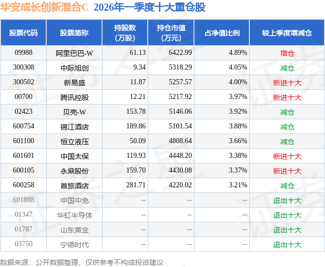 从基金规模来看,华安成长创新混合C基金2026年一季度公布的基金规模为1.08亿元,较上一期规模5109.7万元变化了5710.8万元,环比变化了111.76%。该基金最新一期资产配置为:股票占净值比85.41%,无债券类资产,现金占净值比16.36%。从基金持仓来看,该基金当季前十大股票仓位达38.33%,第一大重仓股为阿里巴巴-W(09988),持仓占比为4.89%。