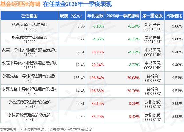 从基金规模来看,永赢半导体产业智选混合发起C基金2026年一季度公布的基金规模为37.51亿元,较上一期规模5.62亿元变化了31.89亿元,环比变化了567.49%。该基金最新一期资产配置为:股票占净值比75.02%,无债券类资产,现金占净值比25.92%。从基金持仓来看,该基金当季前十大股票仓位达67.71%,第一大重仓股为中芯国际(00981),持仓占比为9.4%。