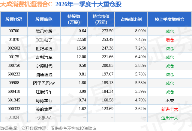 从基金规模来看,大成消费机遇混合C基金2026年一季度公布的基金规模为0.03亿元,较上一期规模831.54万元变化了-510.35万元,环比变化了-61.37%。该基金最新一期资产配置为:股票占净值比85.43%,无债券类资产,现金占净值比13.19%。从基金持仓来看,该基金当季前十大股票仓位达60.05%,第一大重仓股为腾讯控股(00700),持仓占比为8.0%。
