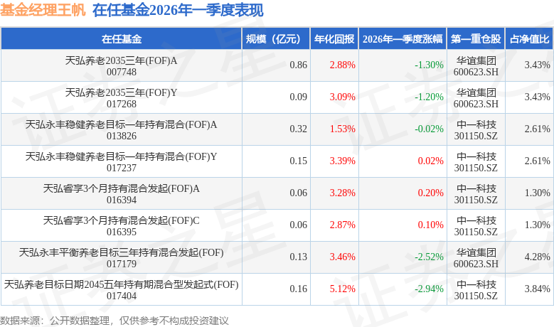 证券之星消息,日前天弘永丰稳健养老目标一年持有混合(FOF)Y基金公布一季报,2026年一季度最新规模0.15亿元,季度净值涨幅为0.02%。