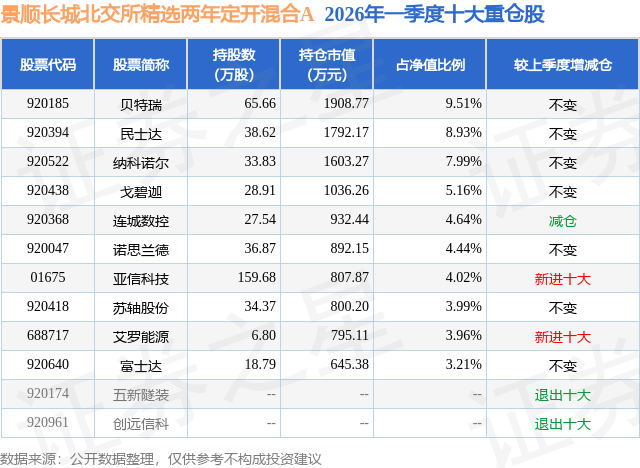 从基金规模来看,景顺长城北交所精选两年定开混合A基金2026年一季度公布的基金规模为1.68亿元,较上一期规模1.26亿元变化了4136.03万元,环比变化了32.72%。该基金最新一期资产配置为:股票占净值比94.78%,无债券类资产,现金占净值比5.38%。从基金持仓来看,该基金当季前十大股票仓位达55.85%,第一大重仓股为贝特瑞(920185),持仓占比为9.51%。