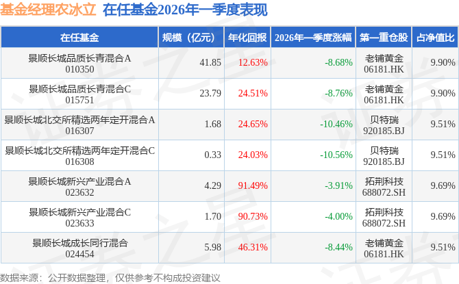证券之星消息,日前景顺长城北交所精选两年定开混合A基金公布一季报,2026年一季度最新规模1.68亿元,季度净值涨幅为-10.46%。