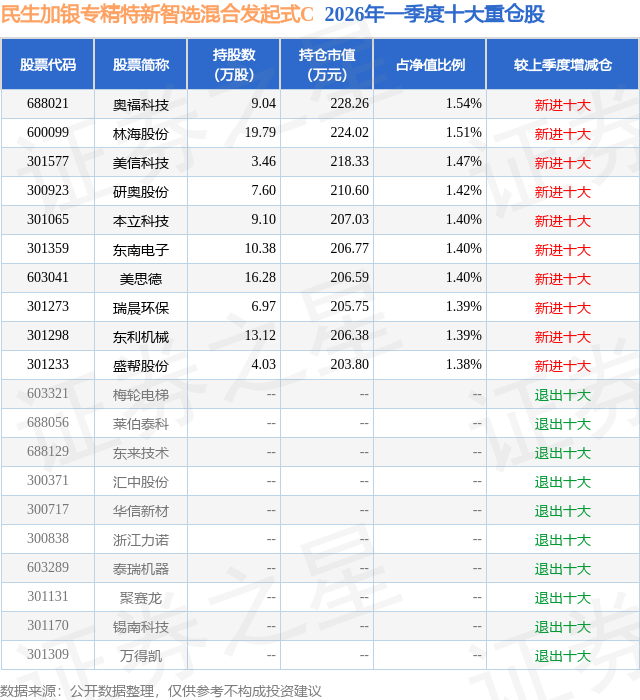 从基金规模来看,民生加银专精特新智选混合发起式C基金2026年一季度公布的基金规模为0.84亿元,较上一期规模850.51万元变化了7586.91万元,环比变化了892.05%。该基金最新一期资产配置为:股票占净值比91.97%,债券占净值比4.65%,现金占净值比3.74%。从基金持仓来看,该基金当季前十大股票仓位达14.3%,第一大重仓股为奥福科技(688021),持仓占比为1.54%。