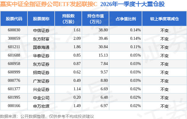 证券之星消息,日前嘉实中证全指证券公司ETF发起联接C基金公布一季报,2026年一季度最新规模2.23亿元,季度净值涨幅为-14.32%。
