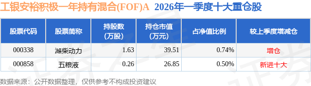从基金规模来看,工银安裕积极一年持有混合(FOF)A基金2026年一季度公布的基金规模为0.35亿元,较上一期规模4424.5万元变化了-880.32万元,环比变化了-19.9%。该基金最新一期资产配置为:股票占净值比1.25%,债券占净值比6.26%,现金占净值比11.24%。从基金持仓来看,该基金当季前十大股票仓位达1.24%,第一大重仓股为潍柴动力(000338),持仓占比为0.74%。